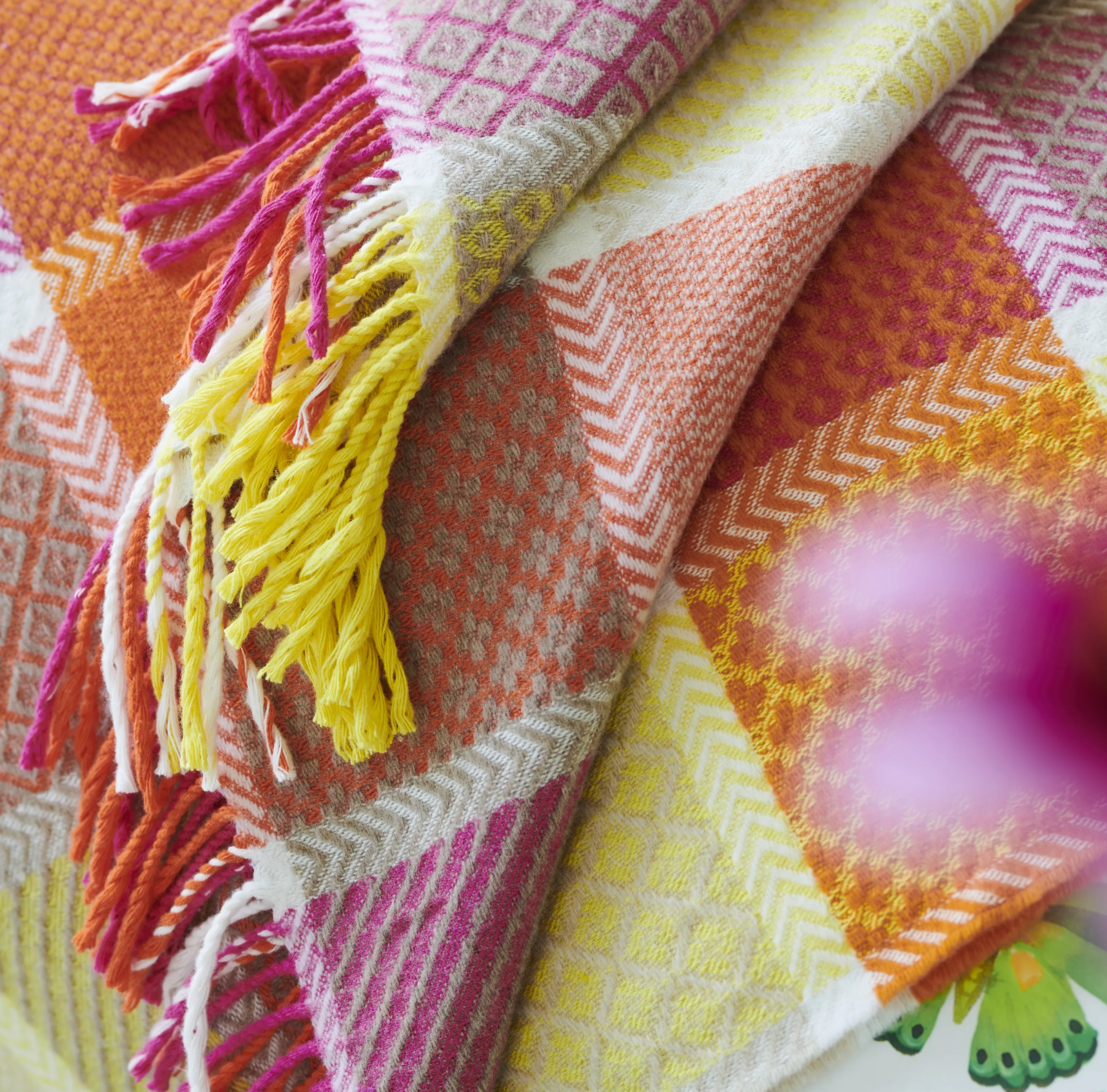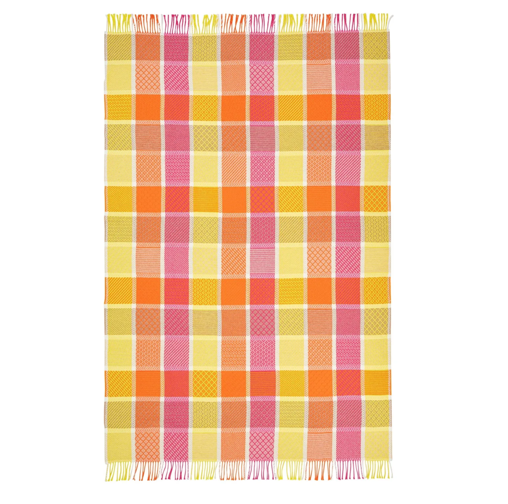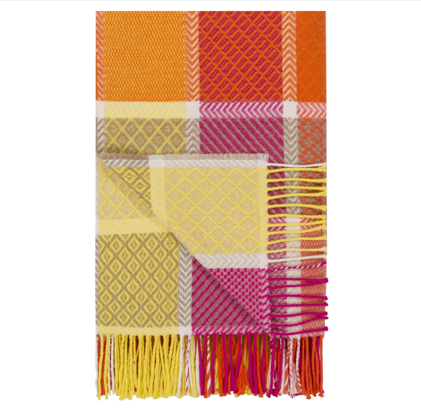Dette blokternede tæppe er jacquardvævet med et flot grafisk mønster. I levende nuancer af zinnia mimosa og fuchsia pink vil dette tæppe tilføje et levende udtryk til din indretning. Vævet med en uldblanding og afsluttet med en frynset kant.