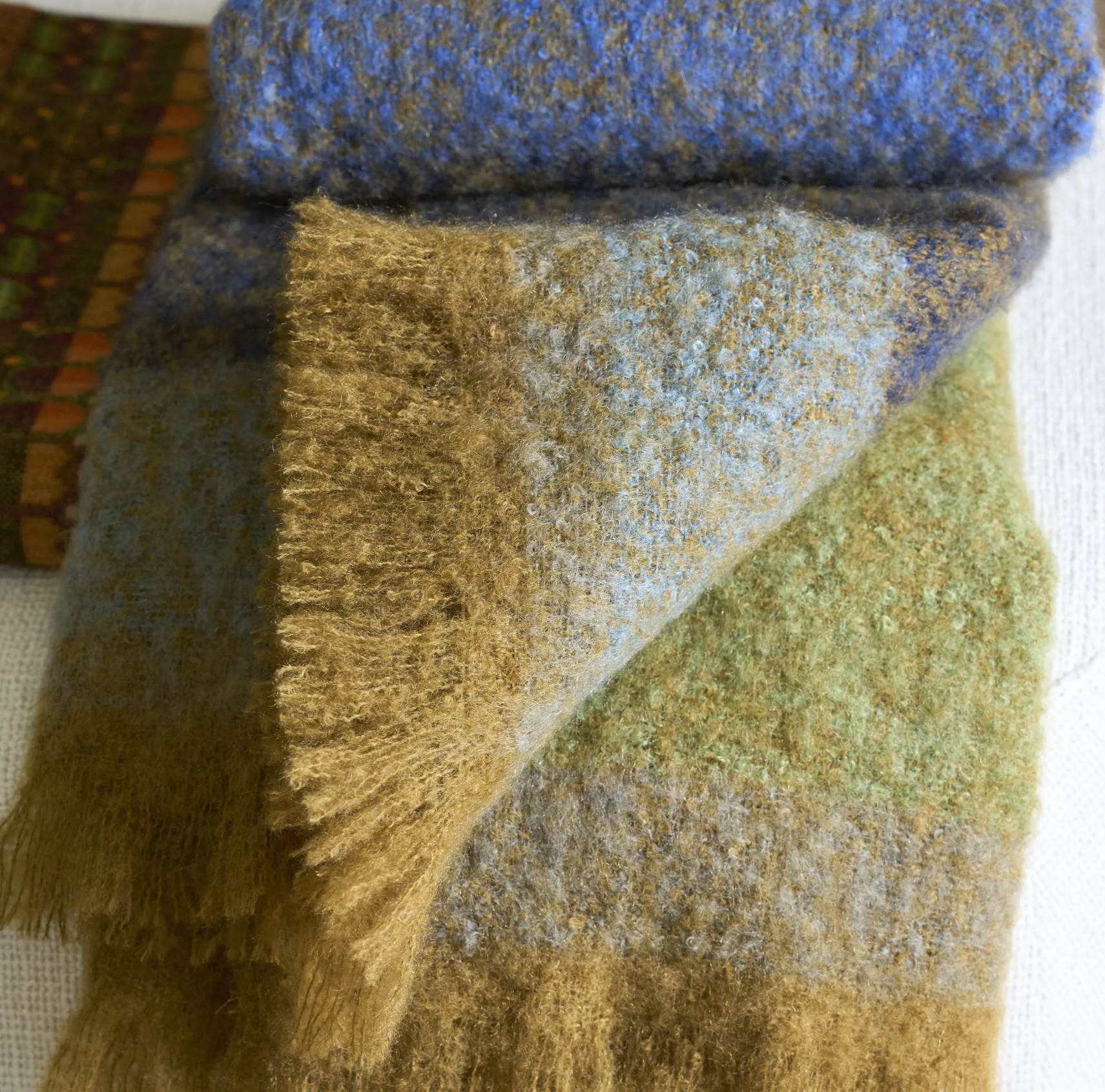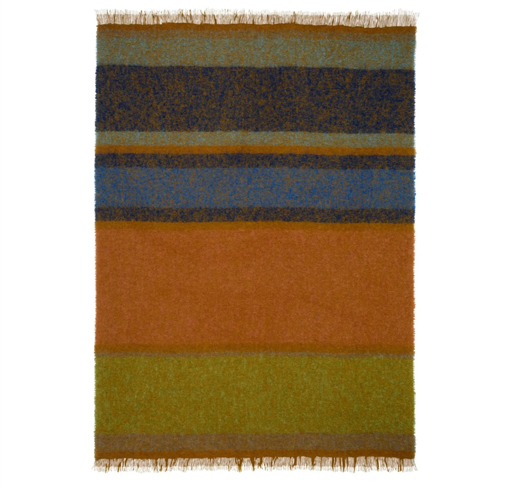 Et vidunderligt, stribet tæppe til indendørs brug, vævet i mohair og børstet for luksuriøs blødhed. I sofistikeret koboltblå med neutrale jordfarver og afsluttet med en frynset kant.