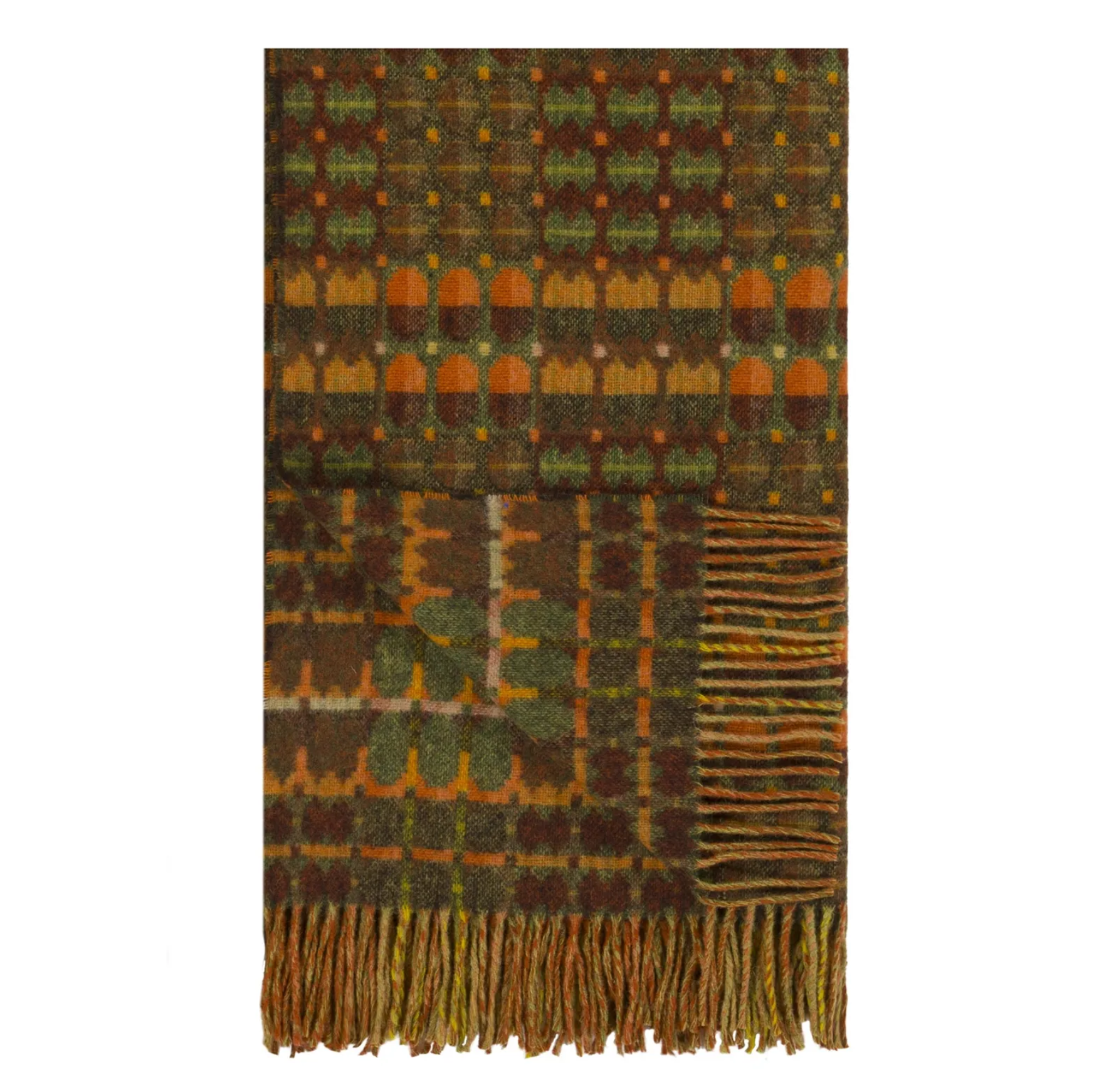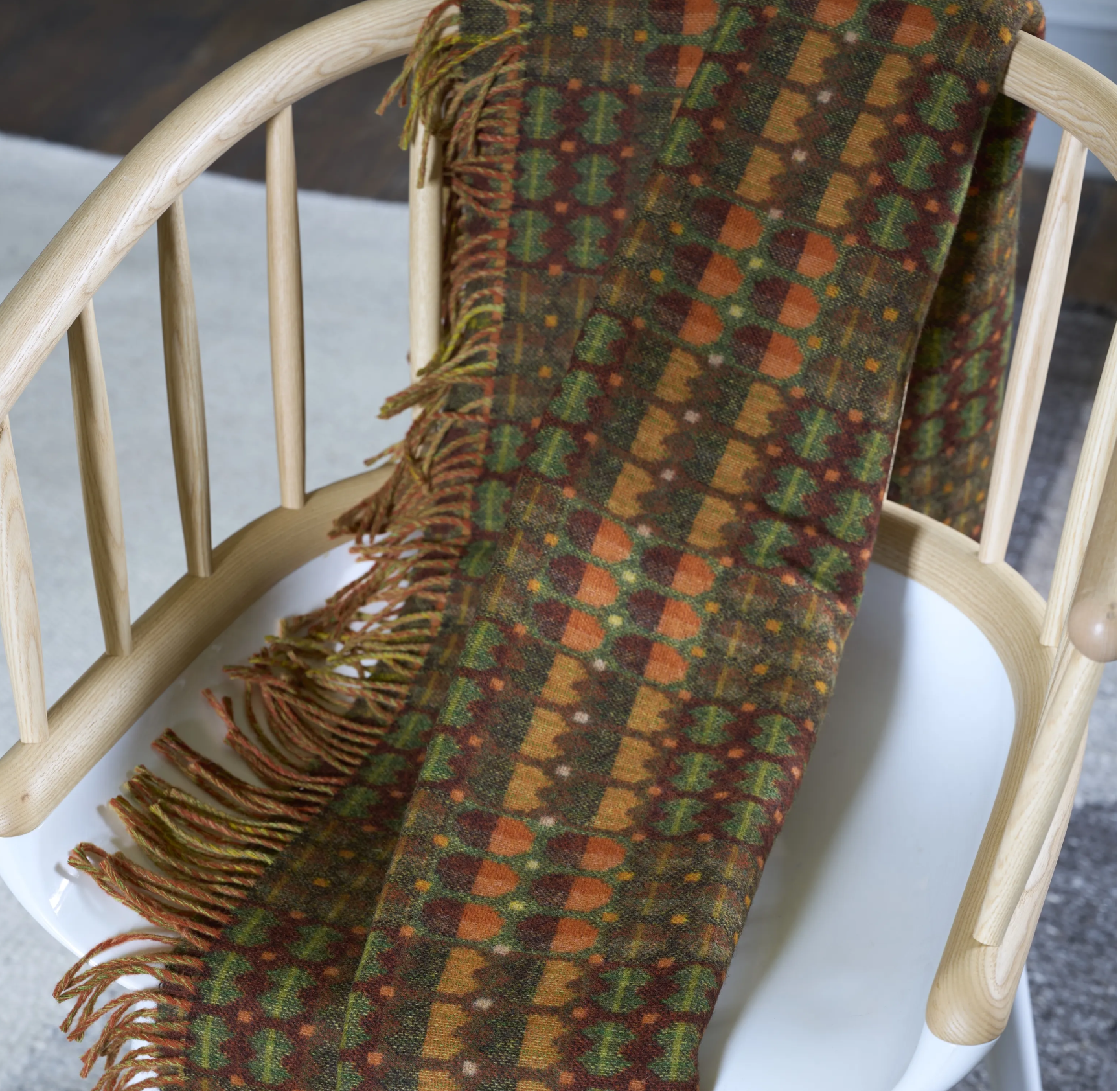 Inspireret af traditionelle walisiske vintage-tæpper, er dette smukke tæppe vævet med 100% ren merinould. I jordfarvede nuancer af sienna, olivengrøn og chokolade - afsluttet med en frynset kant på begge sider.