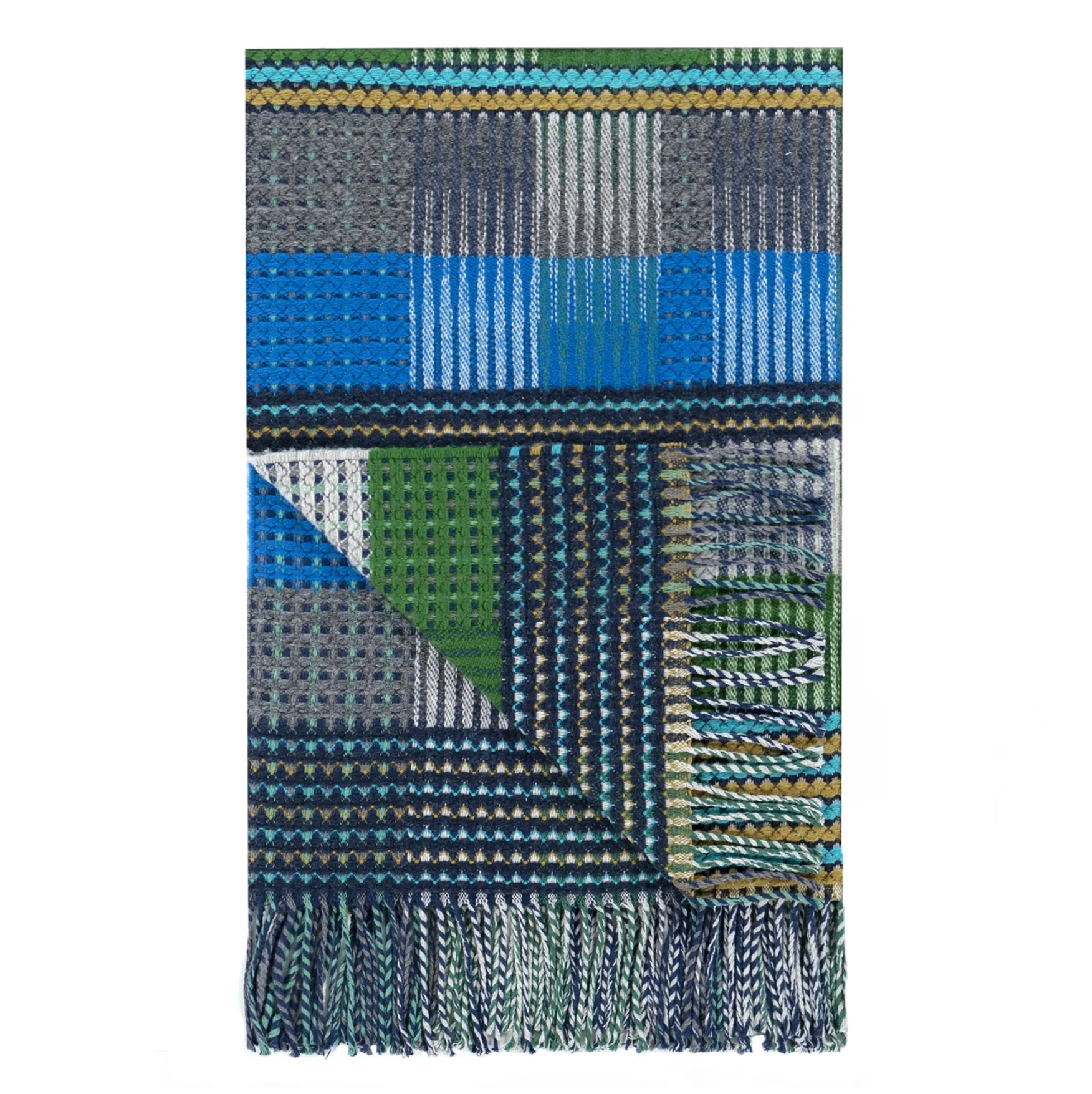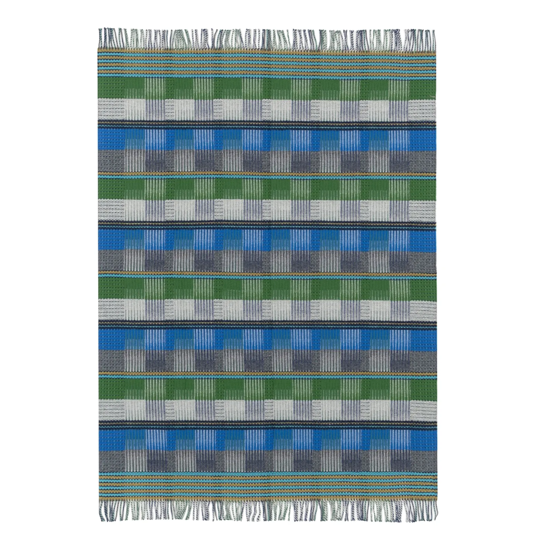 Et tekstureret vævet tæppe i et vintage-inspireret mønster. Dette elegante indendørs tæppe er vævet med et blødt blandet garn i sublime nuancer af kobolt, smaragd og grå - afsluttet med en frynset kant.